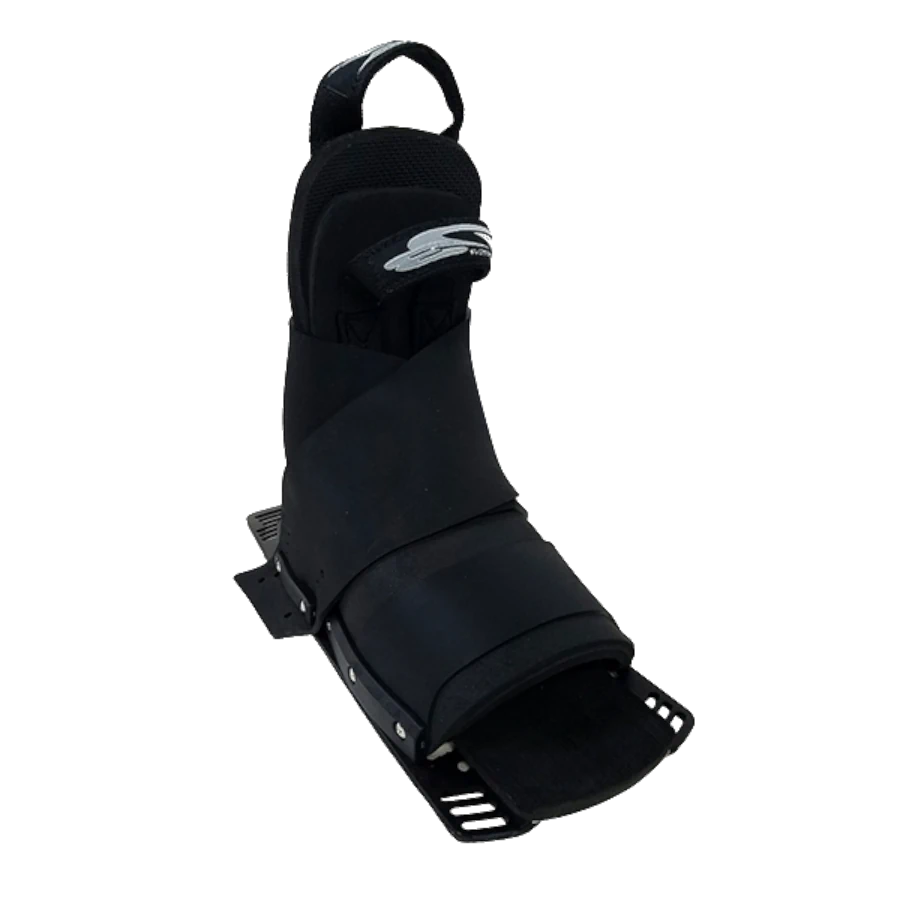 The LEVERAGE BLACKOUT boots are for the skier looking for a no-nonsense, flexible design that fits very snug, keeping the skier connected to the ski, while still allowing a full 360 degrees of motion to the upper ankle. The best word to use in describing the performance of the LEVERAGE BLACKOUT is “forgiving”. If you have tried hard-shell systems or the new wake-board boot style bindings and found them unforgiving or inconsistent then the all new LEVERAGE BLACKOUT boots may be just what you are looking for. Skiers seeking more lateral support and a stiffer upper ankle design see our T-Factor front lace binding.