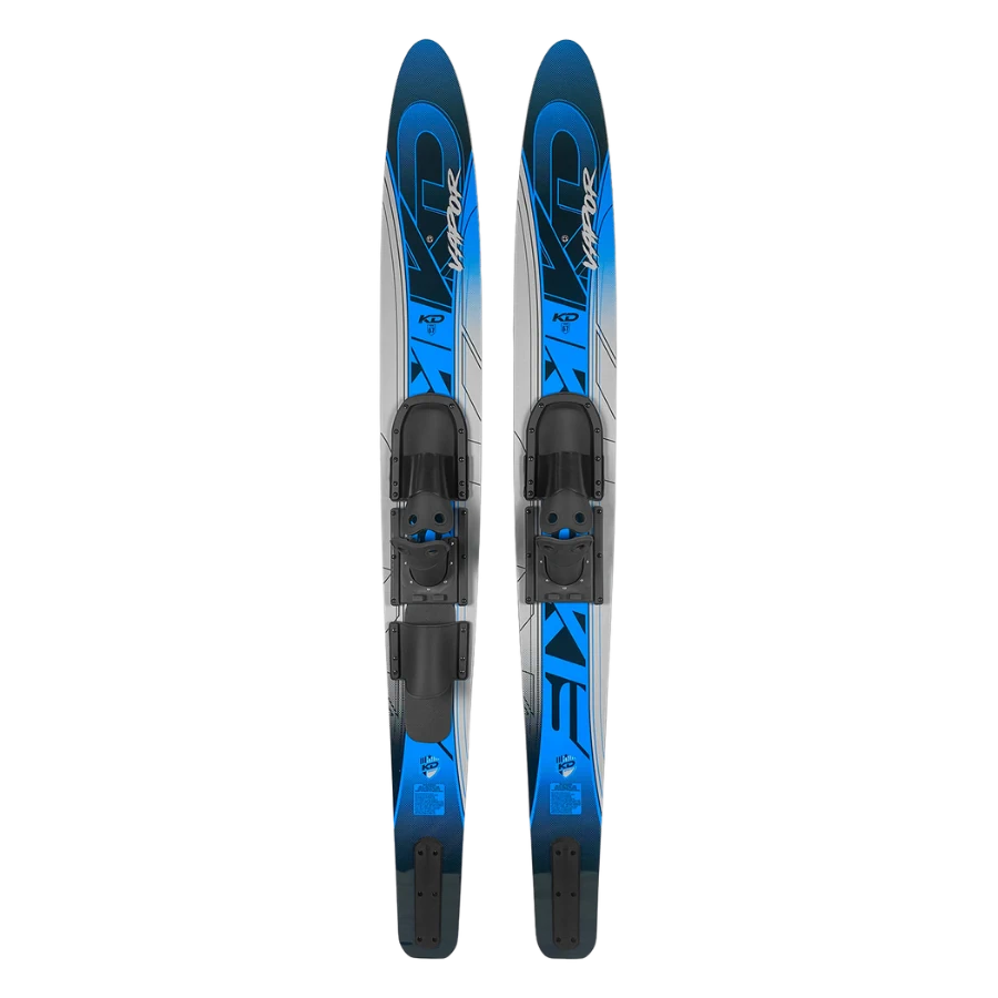 The 2025 KD Vapor Adult Combo Skis makes for the perfect all-round skis. Our V tunnel makes deep water starts easier and provides riders with even turns. The horseshoe adjustable bindings fit a wide range of foot sizes. The inserted tip allows the addition of a stabilizer bar for extra help in keeping the adult combo skis straight and getting the novice skier up on the water and skiing quicker. The more advanced skiers will be able to cut around effortlessly and enjoy their time on the water.