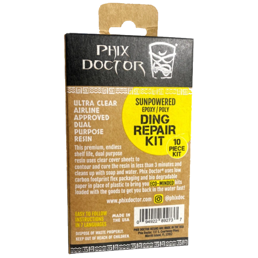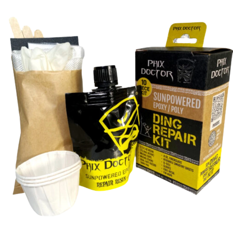 Phix Doctor’s SunPowered  Universal Ding Repair Kit is stocked with endless shelf life, ultra clear, universal sun powered resin, q-cell, dual grit sand pad, gloves and many other helpful items you won’t find in other kits.